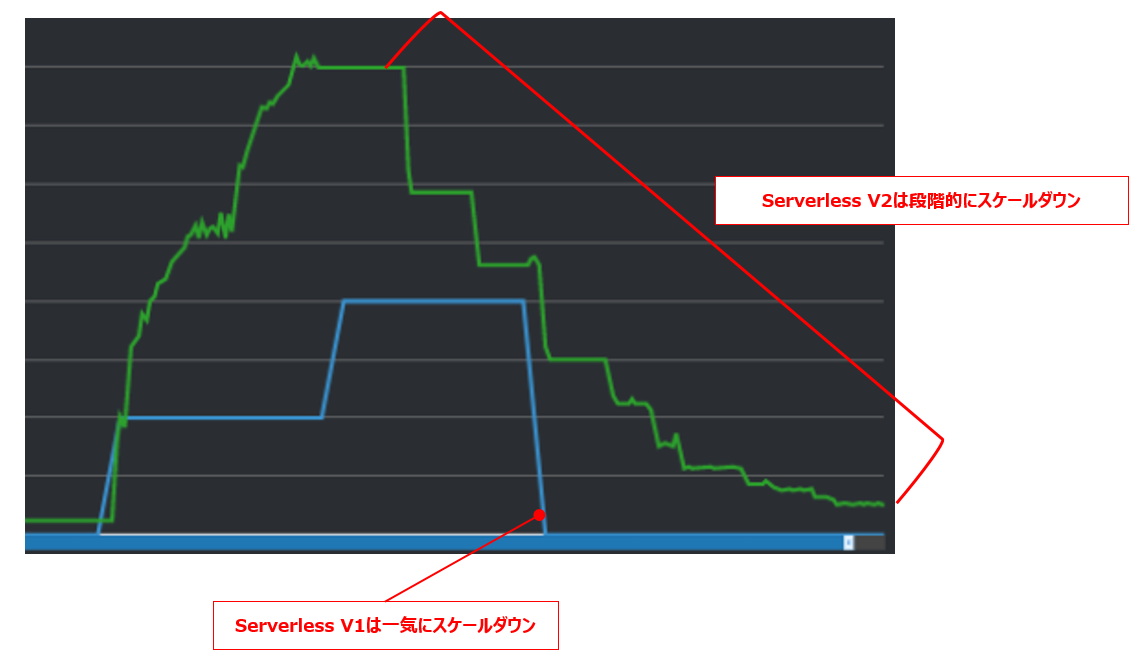 一方Serverless V2は、段階的にゆっくりスケールダウンしています。