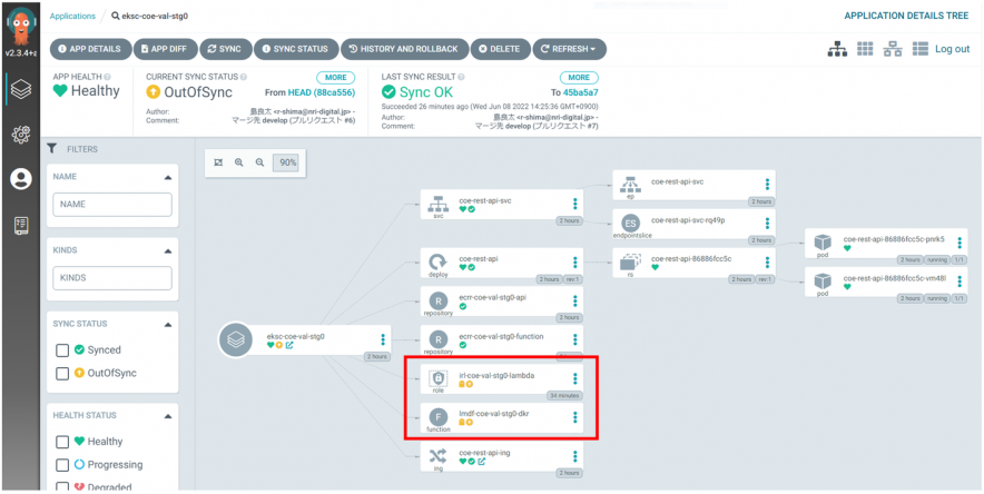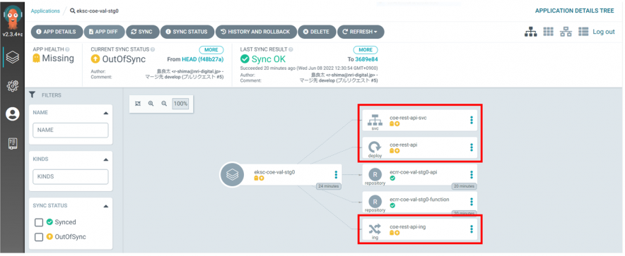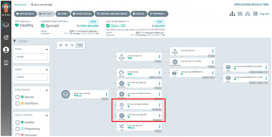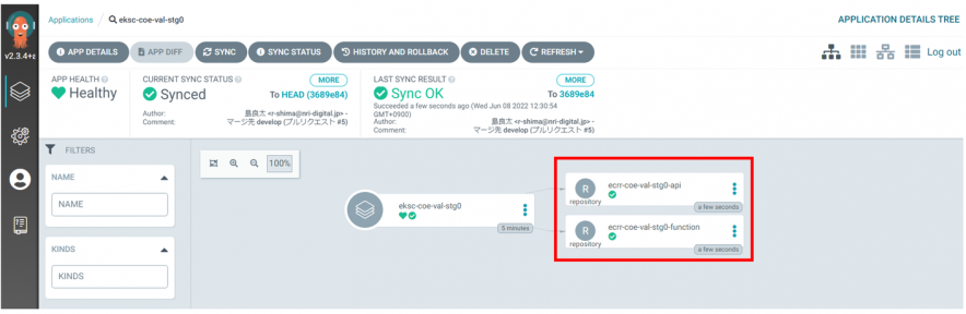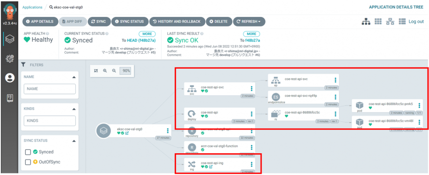 全てデプロイ完了すると、Argo CD上では全てのリソースが「Synced」となります。