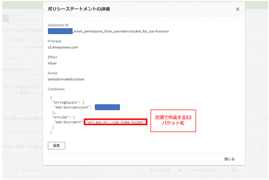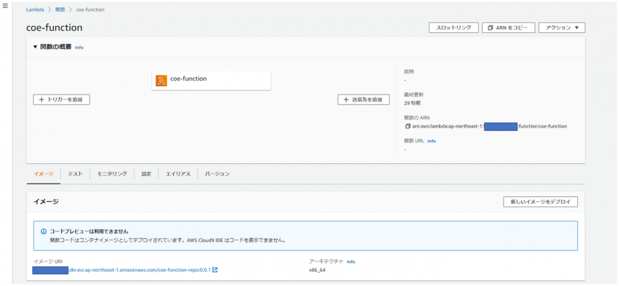 lambdaFunctionARN: arn:aws:lambda:ap-northeast-1:XXXXXXXXXXXX:function:coe-function ←前項で作成したLambda関数名