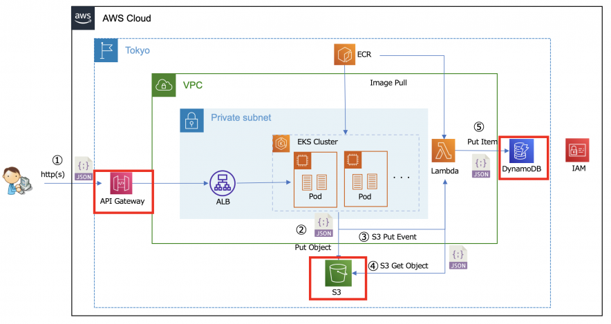 - クライアントからAPI Gateway経由でJSONを受信し、Application Load Ballancer(以下ALB)経由でPod(REST API)へ転送する ※API Gateway→ALB→Podの通信はPrivate
