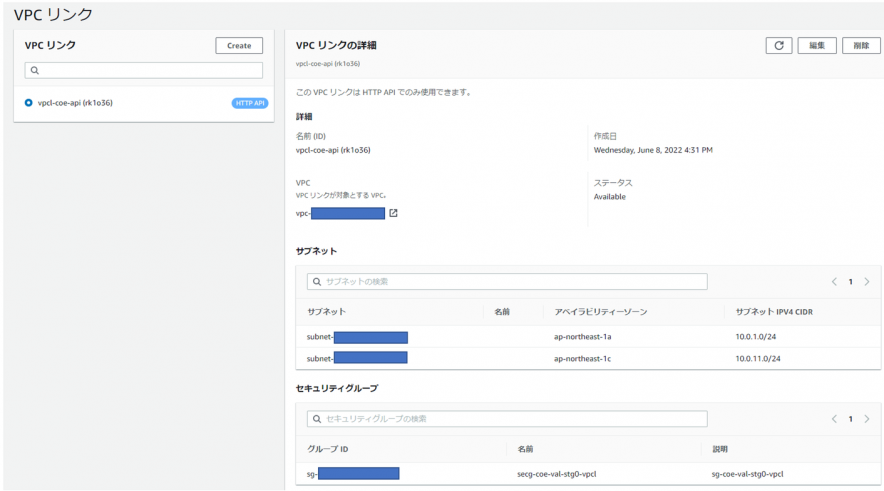 ※上記の通りPrivate統合としたい為「VPC Link」も作成しています