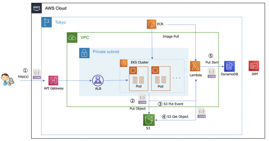- JSONを受信したPod(REST API)はそのJSONをS3バケットへ書き込む(S3 Put Object)