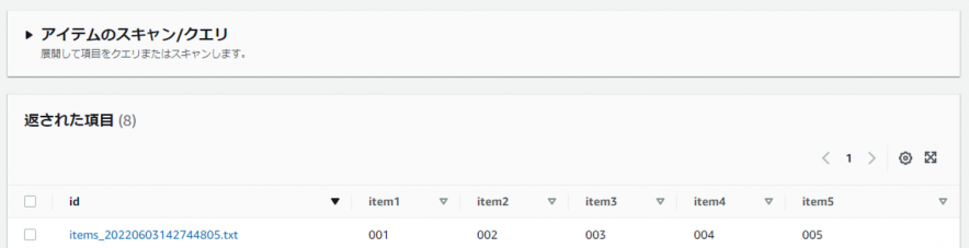 また、作成したDynamoDBのテーブルにJSONデータが正常に登録されました。