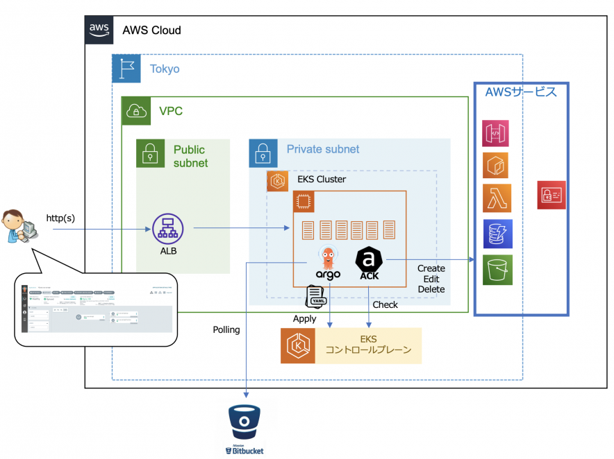 また、前述した通りEKSはk8sに準拠している為、k8sエコシステムの製品を容易に導入可能です。今回はArgo CDを導入し、ACKのカスタムリソースや各種マニフェストをデプロイしていきました。