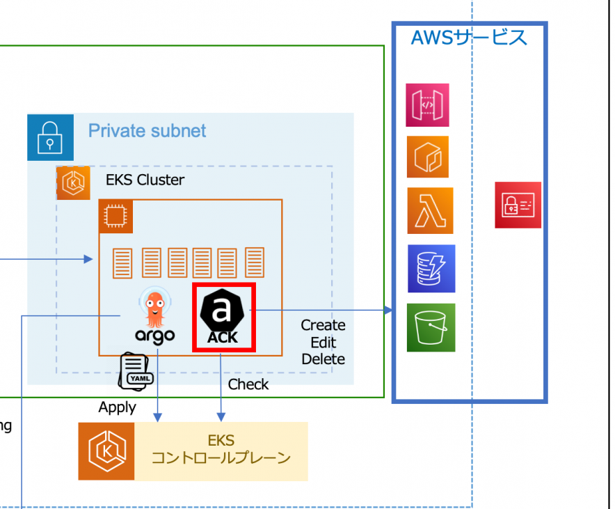AWS Controllers for Kubernetes(以下ACK)は、k8sのCRD機能における「カスタムリソース」や「カスタムコントローラ」の仕組みを利用して、k8sから利用する各種AWSサービスの作成やライフサイクル管理を実行できるようにAWSが開発したツール(AWSサービス用のカスタムリソース/コントローラ)となります。
