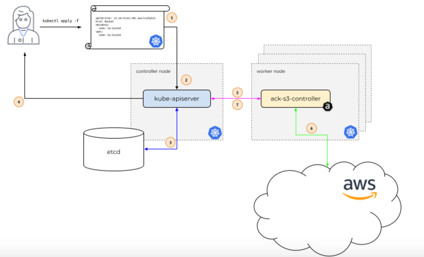ACKの実態はk8sクラスタのデータプレーン上で稼働するPodとなります。Podとして稼働している各AWSサービスのコントローラ(下図例では「ack-s3-controller」)がk8sのコントロールプレーン上のAPI Server(下図「kube-apiserver」)と常時会話をし、実際のAWSサービスの状態を、applyされているリソース定義情報に整えます(※1)。