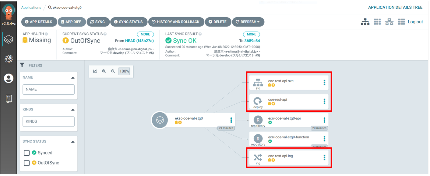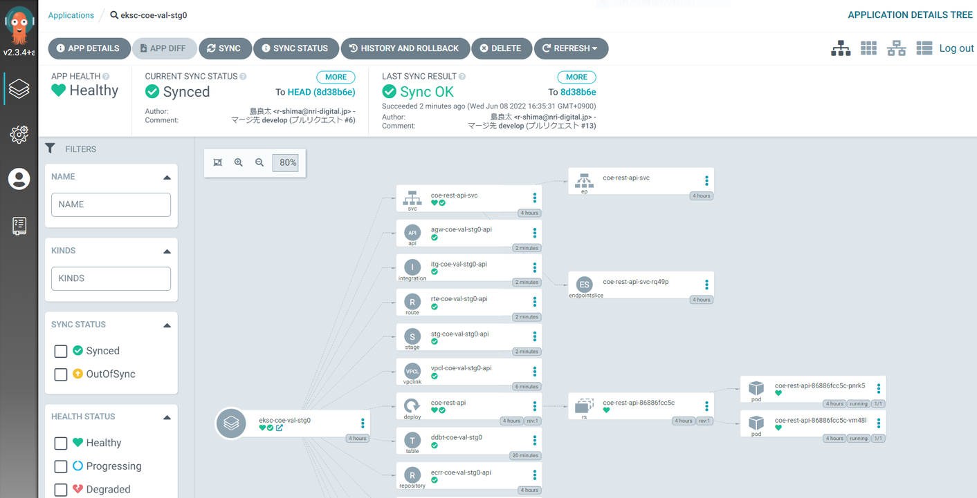 全てデプロイ完了すると、Argo CD上では全てのリソースが「Synced」となります。