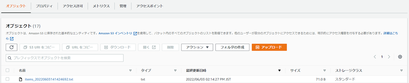 作成したS3バケットにリクエストしたJSONが想定通り保存されました。