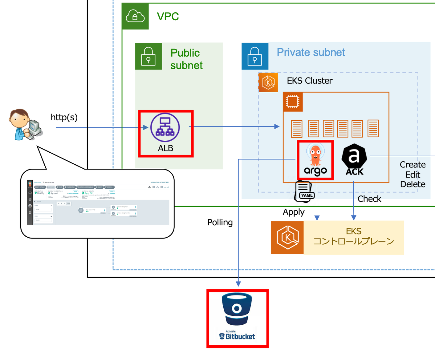 また、前述した通りEKSはk8sに準拠している為、k8sエコシステムの製品を容易に導入可能です。今回はArgo CDを導入し、ACKのカスタムリソースや各種マニフェストをデプロイしていきました。
