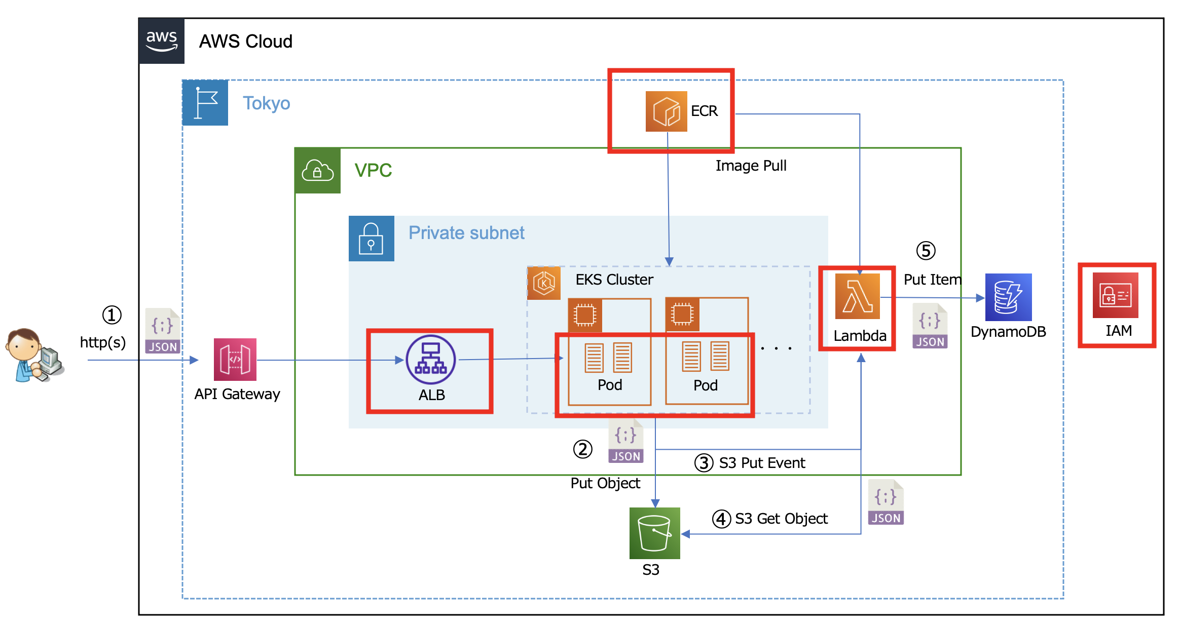 - JSONを受信したPod(REST API)はそのJSONをS3バケットへ書き込む(S3 Put Object)