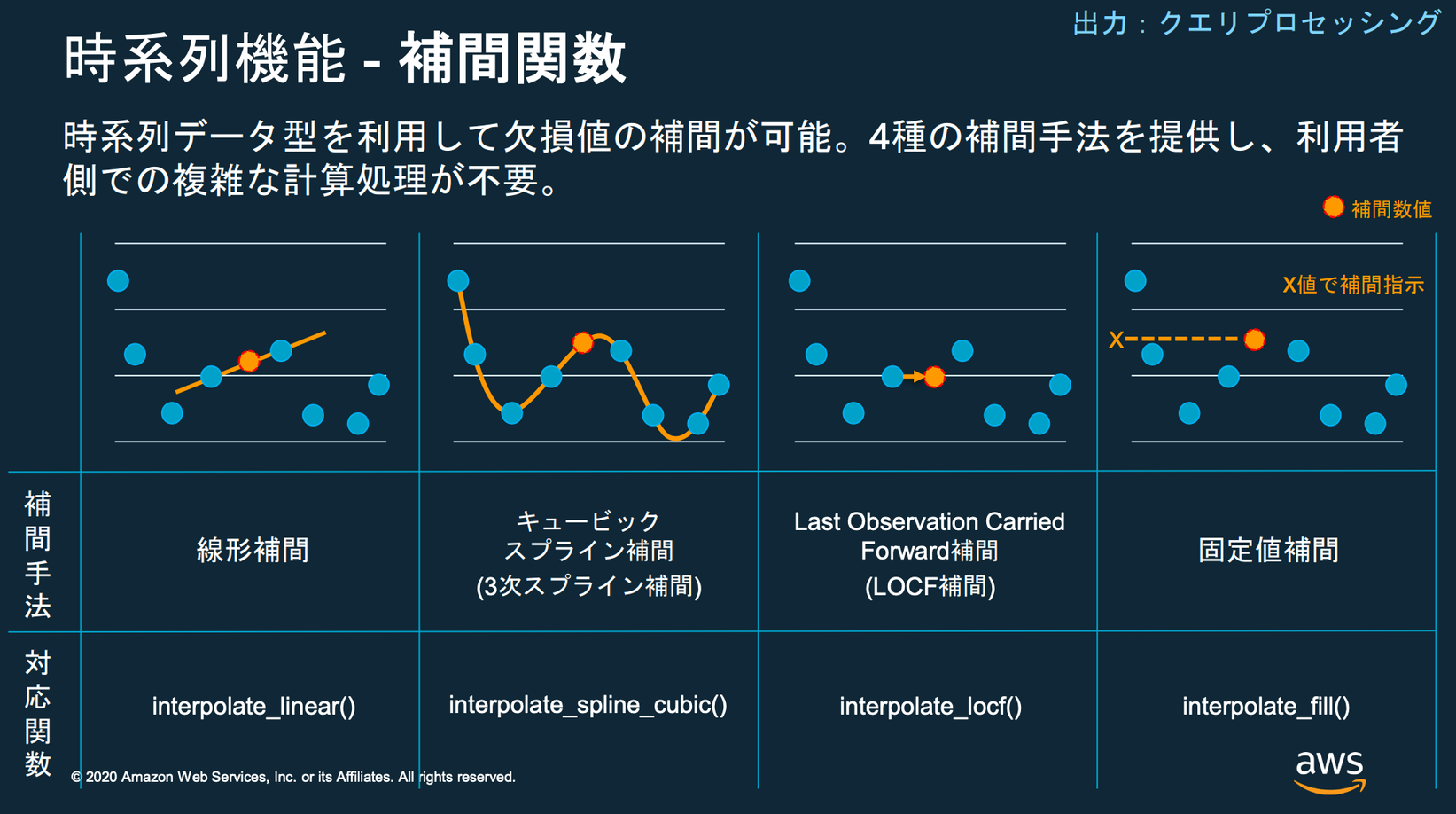 Timestreamを利用するメリットとして、補間関数があります。