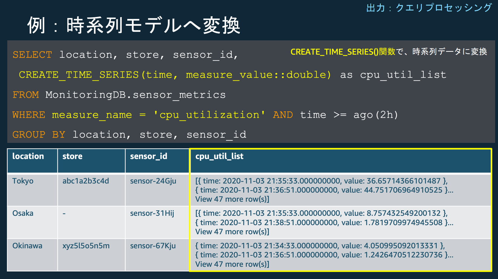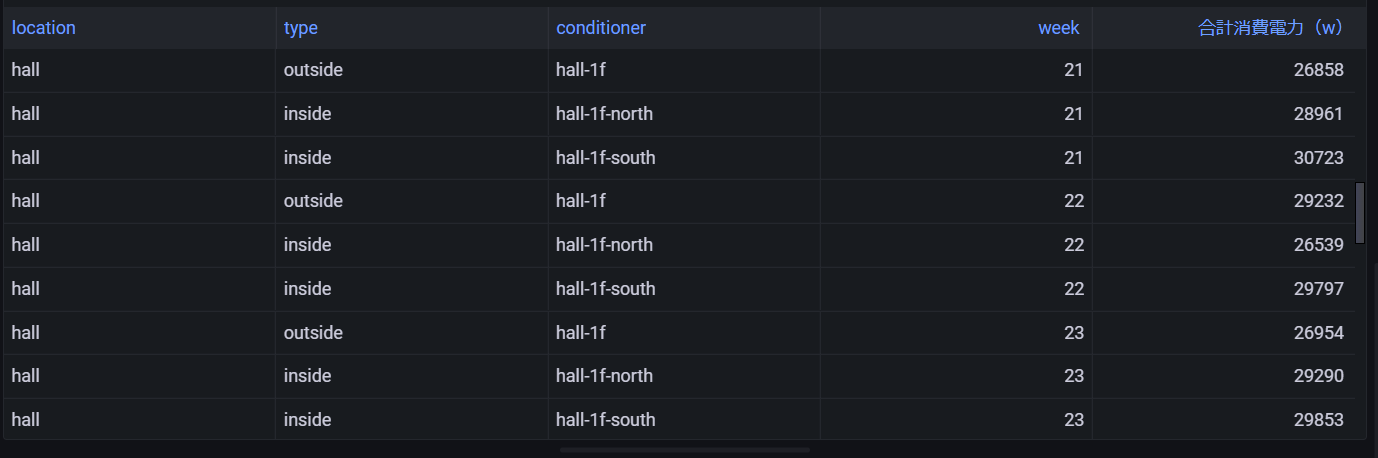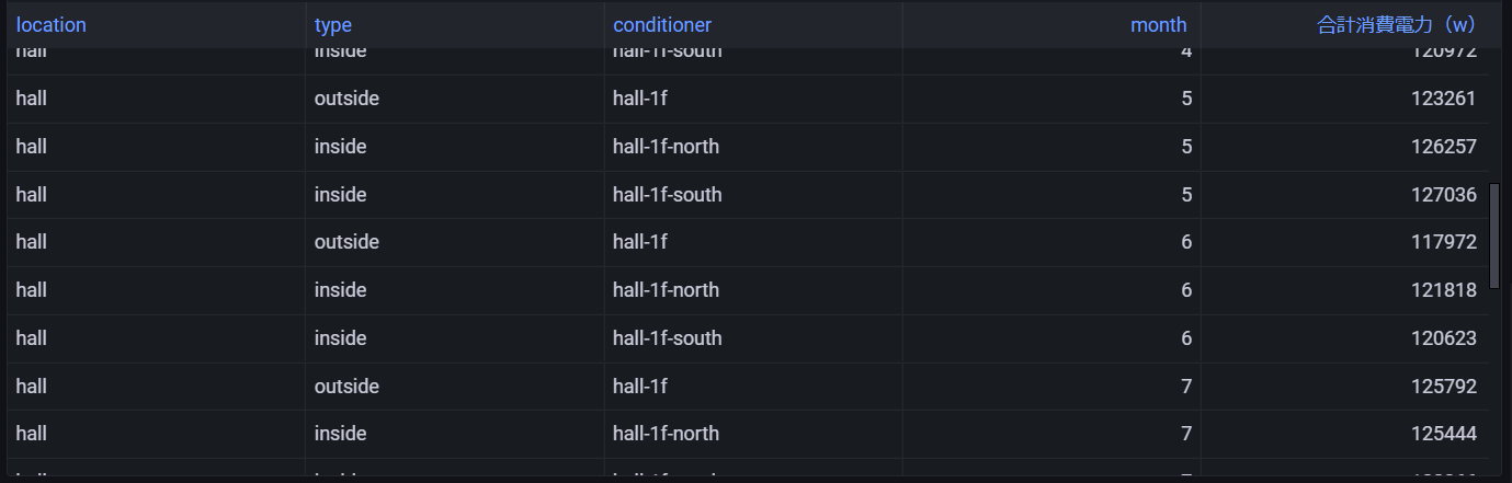 SELECT location,type,conditioner,CREATE_TIME_SERIES(binned_timestamp, sum_power_consumption) as "合計消費電力(w)"