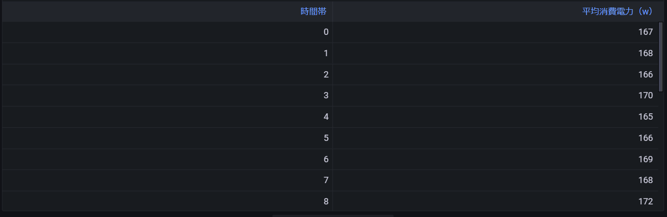 select hour(binned_time) as "時間帯", avg(avg_power_consumption) as "平均消費電力(w)" from (