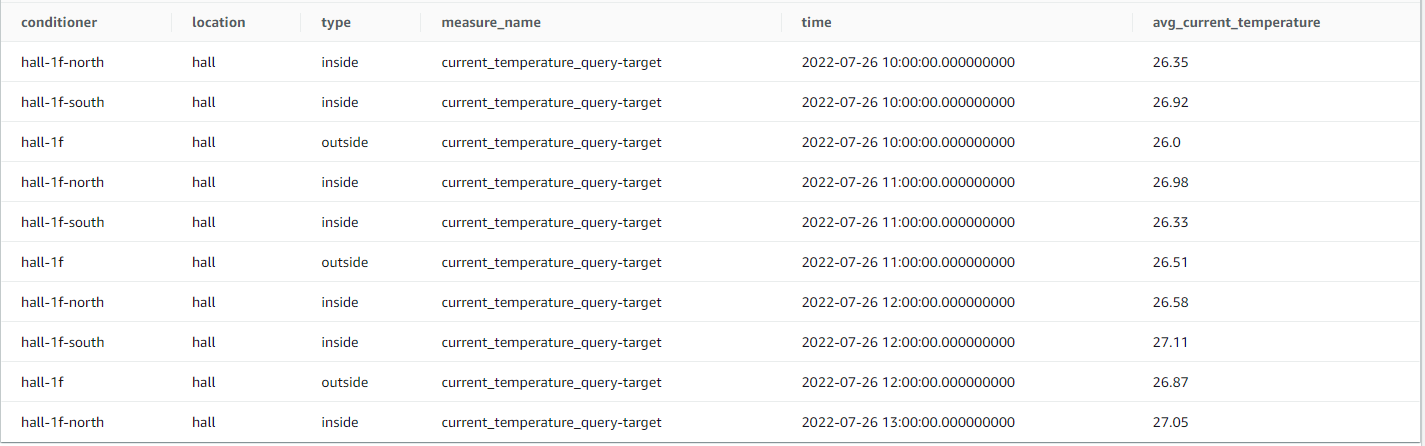 SELECT location,type,conditioner, BIN(time, 1h) AS binned_timestamp, ROUND(AVG(measure_value::double), 2) AS avg_current_temperature