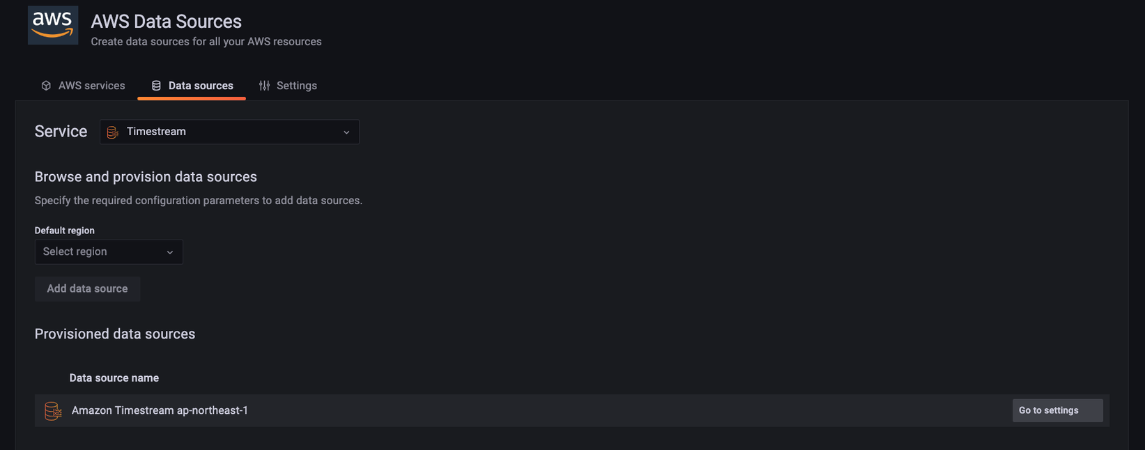 GrafanaのデータソースにTimestreamを設定します。