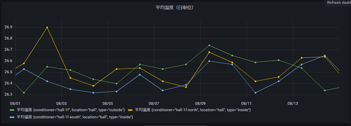 次に平均温度を日単位に変換して表示させてみます。WITH区の集計を時間単位から日単位に変更することで実現できます。※BIN(time, 1h) → BIN(time, 1d)