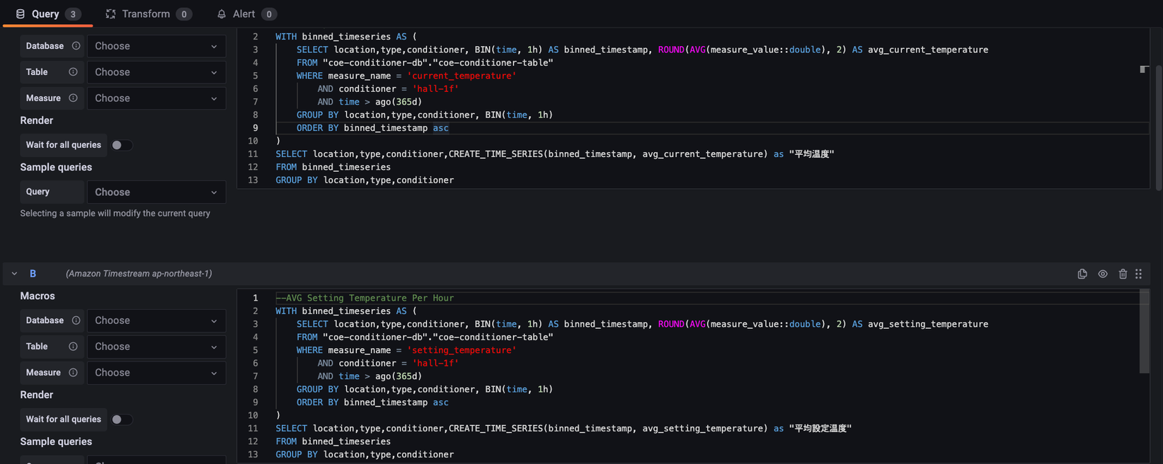 SELECT location, type, conditioner, CREATE_TIME_SERIES(time, avg_current_temperature) as "平均温度" FROM "coe-conditioner-db"."coe-conditioner-table-scheduled" WHERE time > ago(30d) GROUP BY location,type,conditioner ORDER BY conditioner