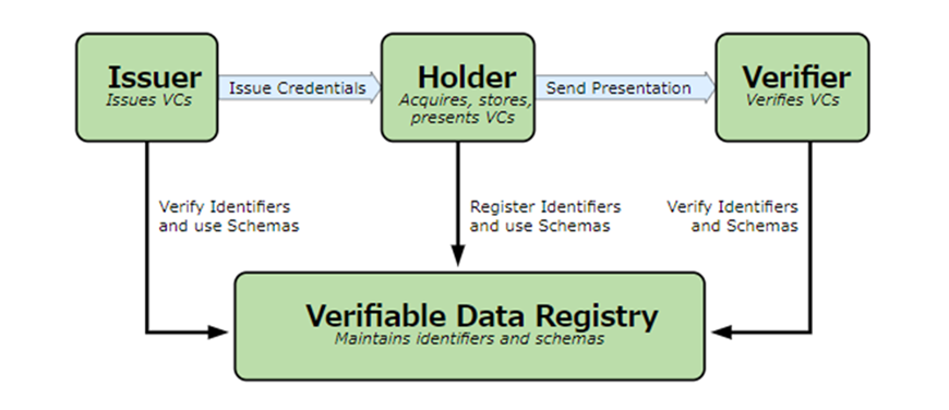 まず、この仕組みにおける資格情報の流通形態をまとめた図が以下です。登場人物として、発行主体をIssuer、提示先をVerifier、所有者をHolderと呼称します。前提として、それぞれが特定のIdentifier(識別子)など検証可能な属性を持ち、Verifiable Data Registry(検証可能な資格情報を格納するレジストリ)に保管します。詳細は後述しますが、やり取りする情報データに、識別子などの属性を含めた署名とその検証を行うことで、資格情報の発行/提示時の真正性確認を行います。本記事では、識別子としてDIDsを用いたVCsの発行~検証を説明します。
