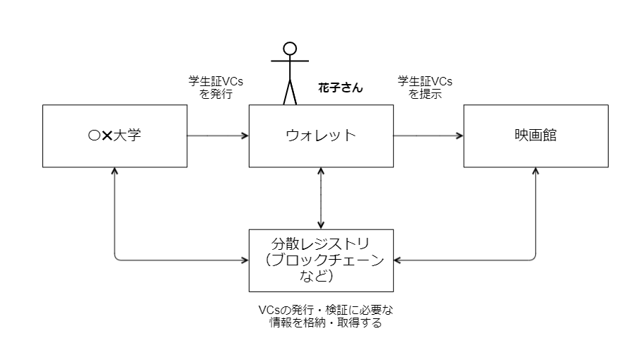 〇×大学に在籍中の花子さん(仮名)が大学に学生証(VCs)を発行してもらい、それを映画館に提示して学割サービスを受ける、というシナリオを思い浮かべてください。