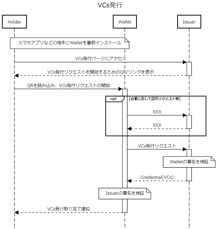 まず初めに、HolderがWalletを介してIssuerに資格情報(=VCs)の発行を依頼します。Holderが依頼する形式は明確に定められておらず、Issuerが事前に用意しておいたVCs発行用のQRコードを読み取る方法などが提案されています。