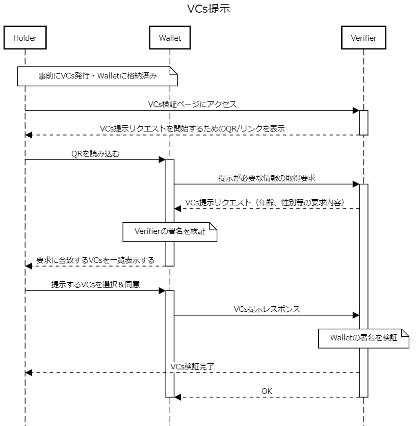 続いて、VCs発行後、Walletに格納したVCsを提示し、Verifierに検証を受ける流れは以下です。