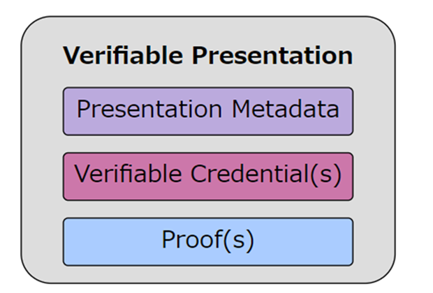 また、Issuerから発行してもらった複数のVCsを一度にVerifierに提示できるVPs(Verifiable Presentations)という形での提示も規定されています。VPsは、1つ以上のVCsデータを含む電子署名付きJSONドキュメントです。VCsと同様の3層構造となっており、Presentation Metadata、Verifiable Credential(s)、Proof(s)で構成されます。