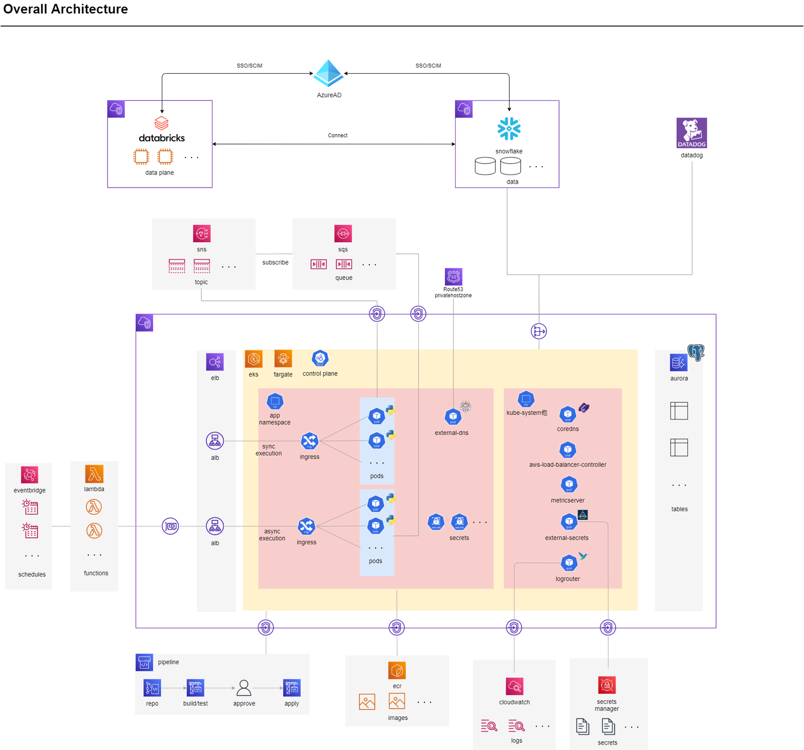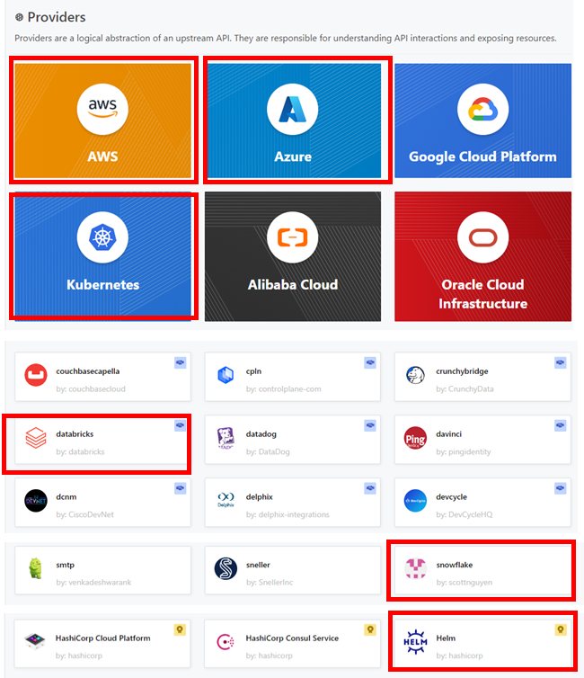 今回のプロジェクトでは、EKS周辺のサービスとして、他のAWSサービスの他、Azure AD、snowflake、Databricksを利用しています。これらサービスの構成管理を、同じ枠組みで扱うため、Terraformを採用しています。Terraformでは、下記に示す通り、AWS、Azureの他、snowflake、Databricks、 kubernetes、 helm(EKSにアドオンを設定する際に利用する)といったプロバイダに対応しています。
