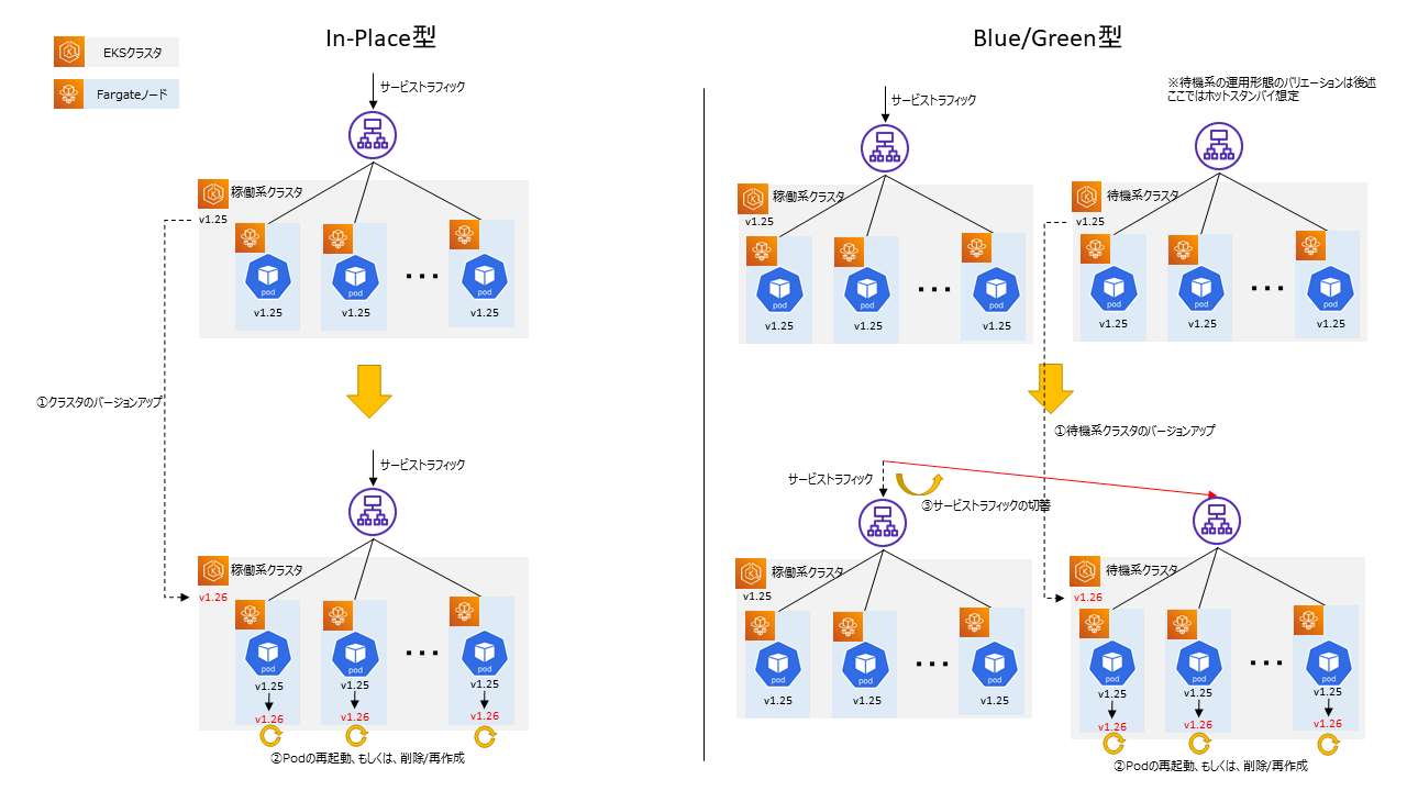 - クラスタのバージョンアップはIn-Place型ではなく、Blue/Green型でバージョンアップを行うことが望ましい