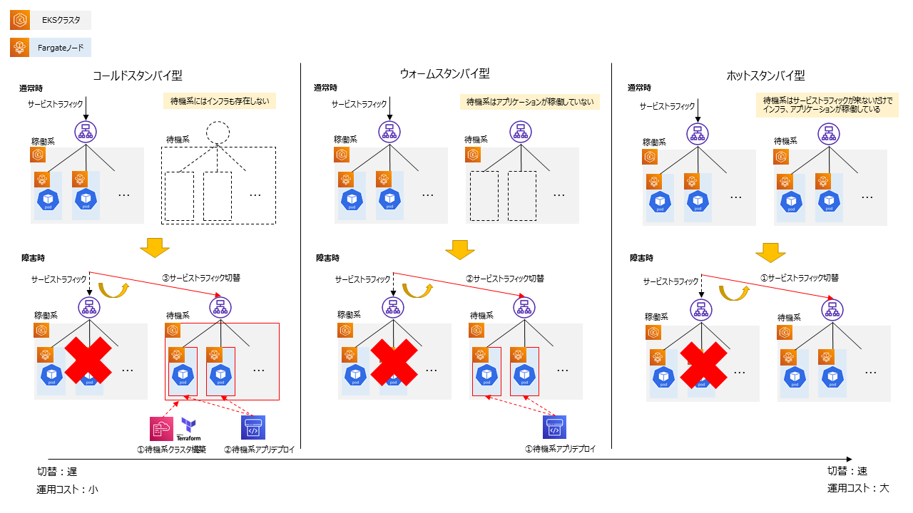 待機系のクラスタ自体は稼働させているが、Podを引き落としているケース。切替の都度Podのデプロイが必要となり、運用費は今回の例の中では中間になる。現在では、PodのデプロイはCICDツールで行うため工数・時間はほとんどかからない。また、ワーカのFargateノードも立ち上がっていない状態であるため、待機時の課金も抑えることができ、EKS on Fargateでは有力な選択肢となる。一方、EKS on EC2やAzure AKSなどIaaS型のkubernetesサービスでは、Podが立ち上がっていなくてもVMが起動しているだけで課金が発生する。そのため、VMをシャットダウンしておき、Podのデプロイに先んじて起動させるなどの対応や、効率よく運用するために、これらのCICDツールへの組み込み等が必要になる。