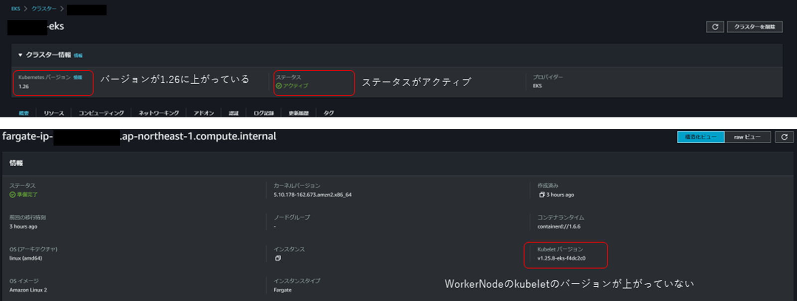 下記に更新後のクラスタの状況をマネジメントコンソールで確認した結果を示します。クラスタのkubernetesバージョンは1.26に上がっていますが、バージョンアップ時にデプロイされていたPodが稼働するFargateノードのkubeletバージョンは1.25のままで上がっていないことが確認できます。