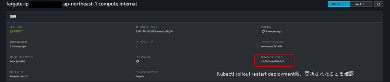 バージョンアップを行うと、先にコントロールプレーンのバージョンが上がり、これにワーカノードのバージョン(Fargateノードのkubeletのバージョン)を合わせるために、バージョンアップ時点で現存するPodについては再作成、再起動によりFargateノードを再取得する必要があります。