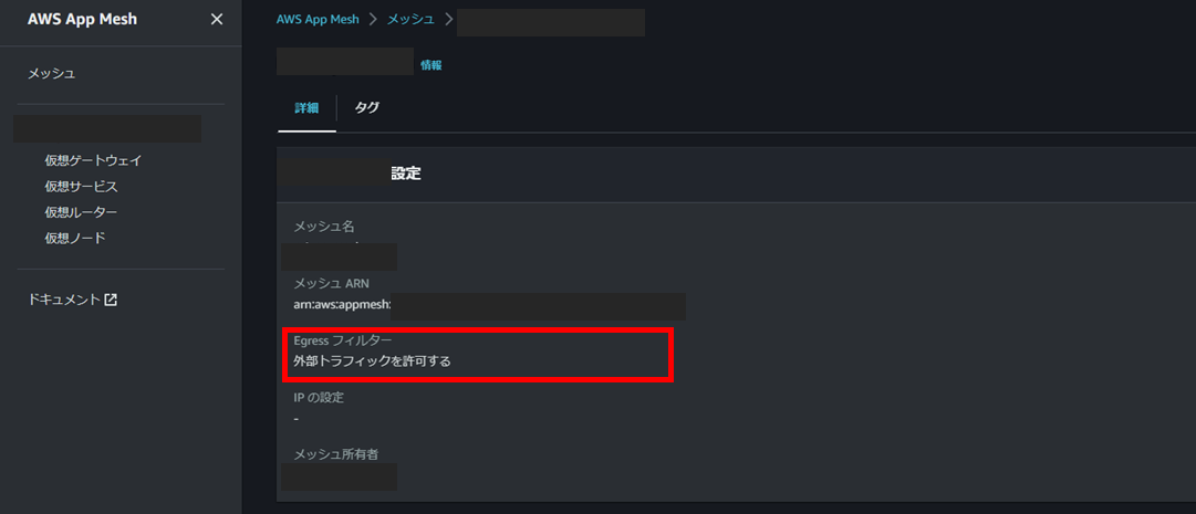 AppMeshを介してDatadogへの接続を試行する際に、一時的にAppMeshの「Egress フィルター」を「外部トラフィックを拒否する」から「外部トラフィックを許可する」に変更したい状況になったため、マネジメントコンソールからこの変更を行いました。