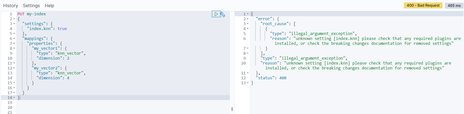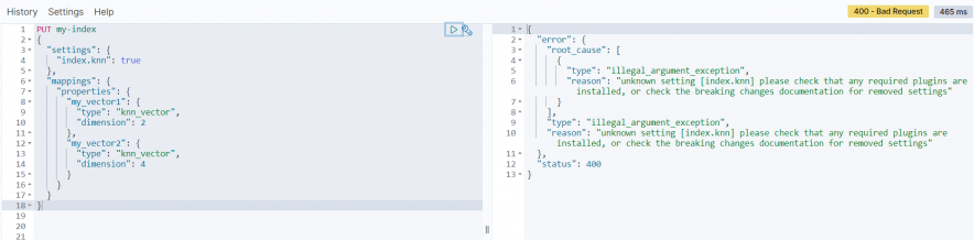 残念ながら、上記の通りk-NNベースのインデックスの作成ができないようです。念の為以下ページを参考に導入されているプラグインを確認してみます。