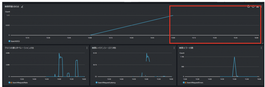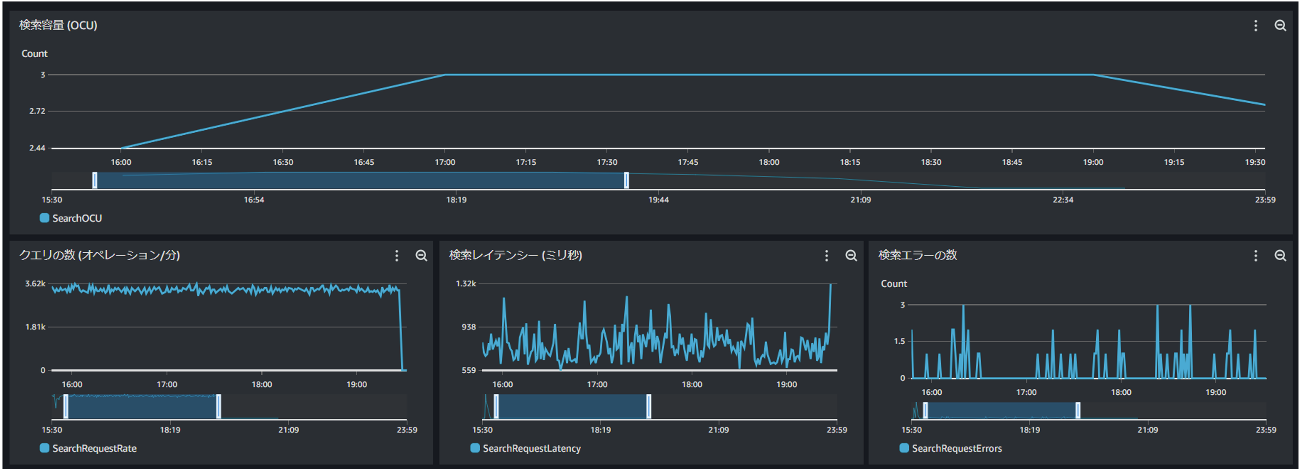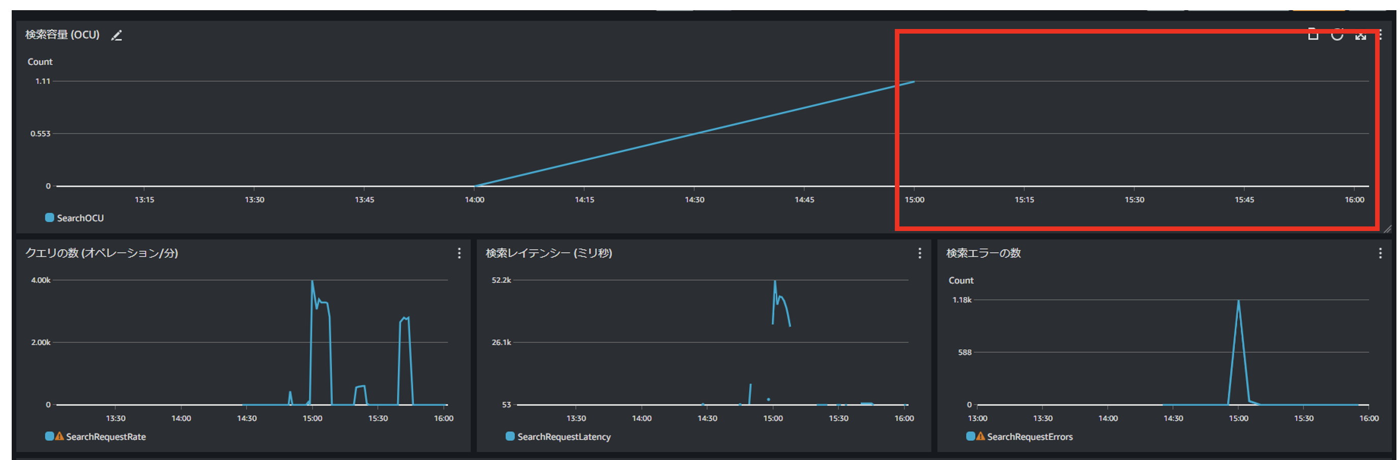 平均OCU数が「3」で、デフォルトの「2」からあまり変動していません。その結果、検索エラーが発生しており、平均レイテンシも悪いです。