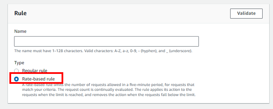 - Rate limitに任意の数字を入力(今回は最小の「100」を入力)し、Request aggregationに「Custom keys」もしくは「Count all」を選択(今回は「Count all」を選択)します。 ※「Custom keys」と「Count all」の違いは後述