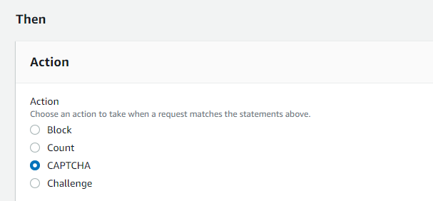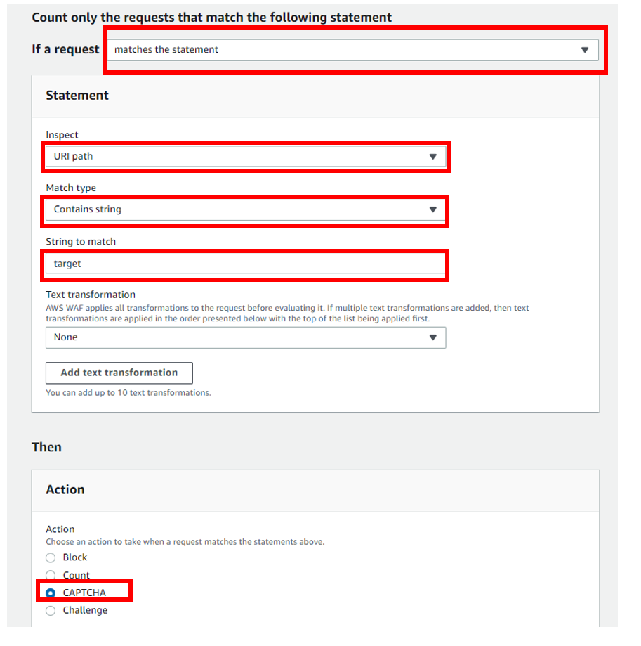 - スコープダウンステートメント にてレートリミットの対象とする条件を設定(今回は「target」というURLを対象)し、Actionに「CAPTCHA」を選択します。