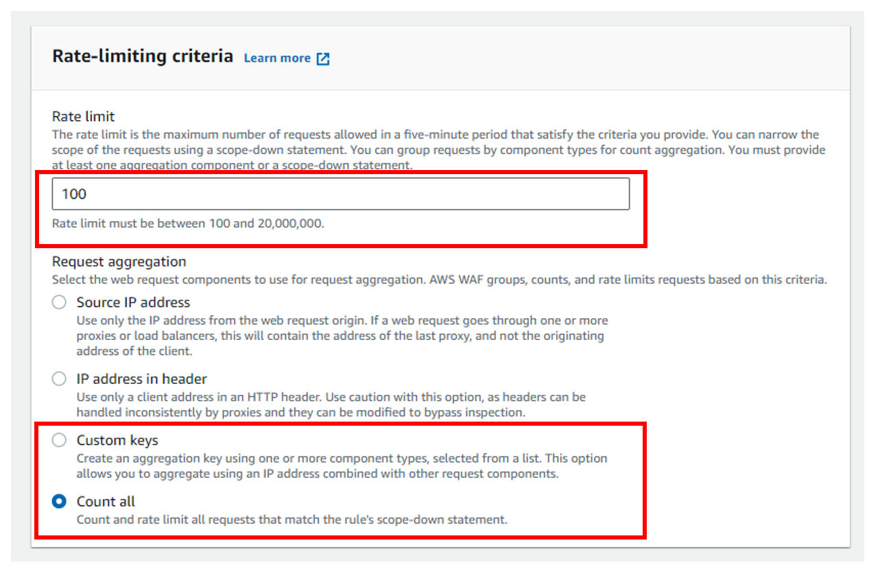 - Rate limitに任意の数字を入力(今回は最小の「100」を入力)し、Request aggregationに「Custom keys」もしくは「Count all」を選択(今回は「Count all」を選択)します。 ※「Custom keys」と「Count all」の違いは後述