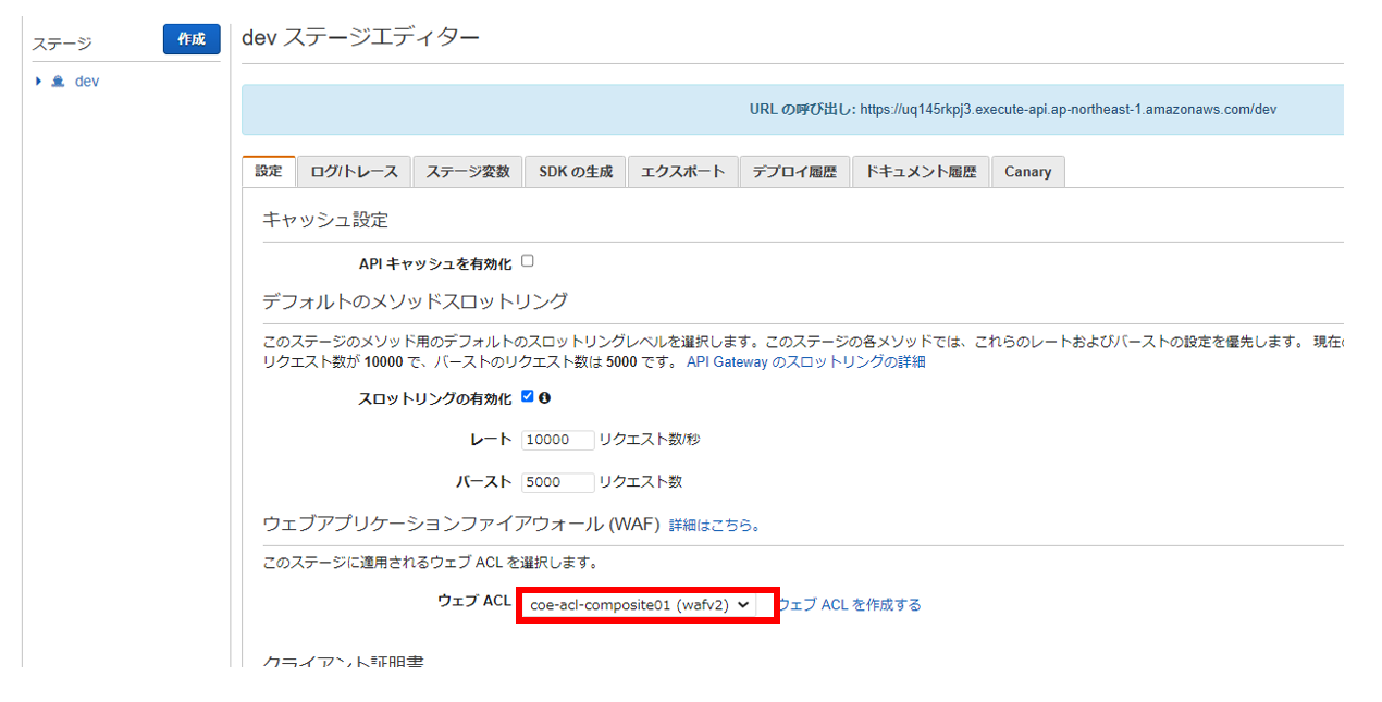 デプロイしたAPI Gatewayに作成したWAF ACLsを紐付けます。