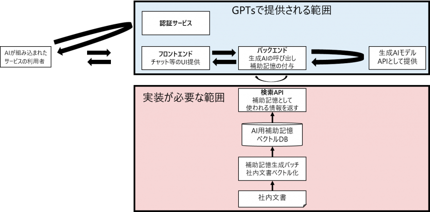 GPTsからAPIを呼び出すことができるので、この必要な独自ナレッジの検索用APIさえ作れば、フロントエンドやバックエンドなどはサービスとして提供されているものを使うことができます。独自の挙動をさせたい部分のみを作れば良いということなので非常にお手軽です。