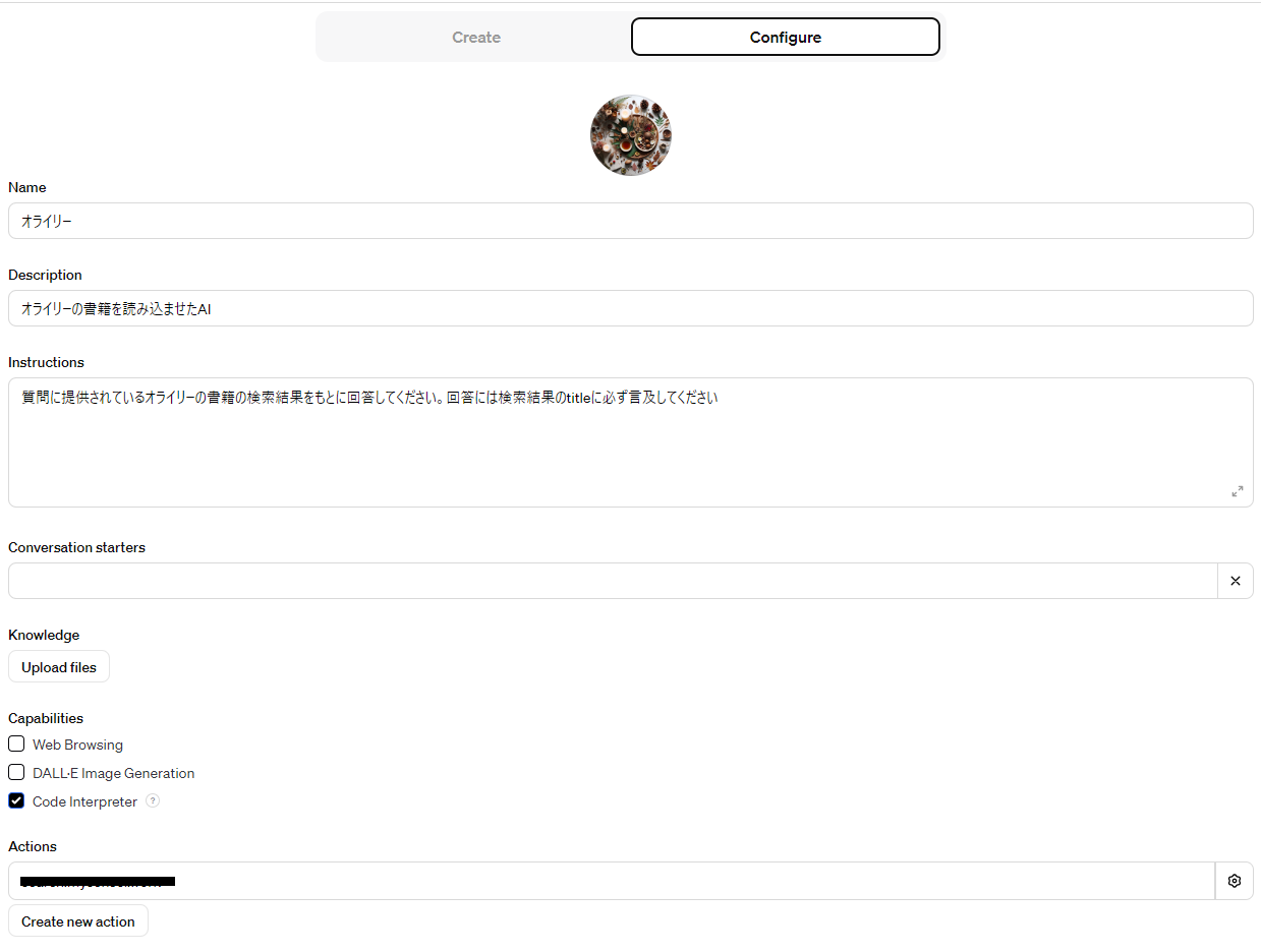 +ボタンをクリックし、表示された画面でConfigureを選ぶとAIの振る舞いをカスタマイズする画面が出てきます。