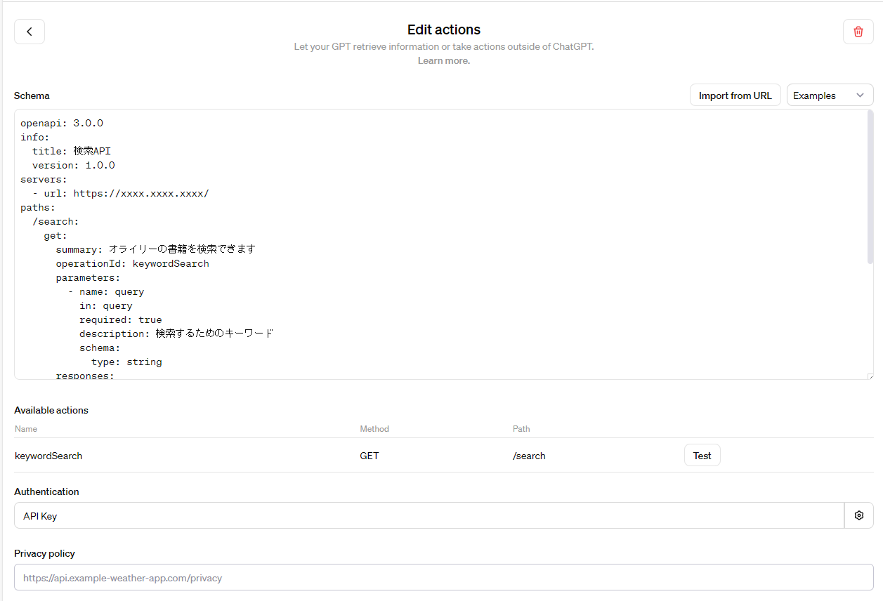 API呼び出しができるようにActionsの設定をします。記載する必要があるのはSchemaとAuthenticationだけです。