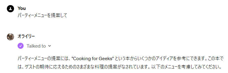 GPTsは公開しない自分専用のものを作ることができるので、今回は個人的に持っていたオライリーの電子書籍40冊をベクトル化し、これを与えたRAGを作ってみました。完成後のAIとのやりとりは以下のような感じです。著作権があるので書籍の内容は伏せました。