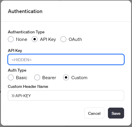 AuthenticationにはAPI Keyを選択し、ヘッダ名とKeyの値を入れました。