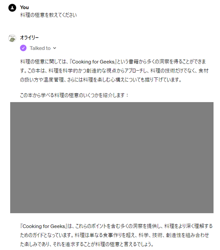 GPTsは公開しない自分専用のものを作ることができるので、今回は個人的に持っていたオライリーの電子書籍40冊をベクトル化し、これを与えたRAGを作ってみました。完成後のAIとのやりとりは以下のような感じです。著作権があるので書籍の内容は伏せました。
