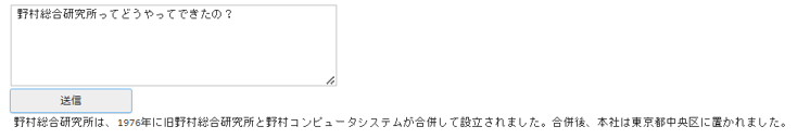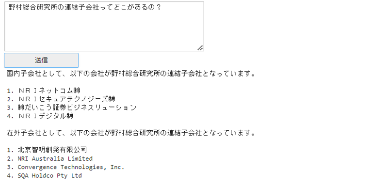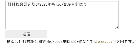 また、他にも有価証券報告書内の情報に関する質問を投げかけたところ、有価証券報告書内のデータを加味した応答結果が返されました。