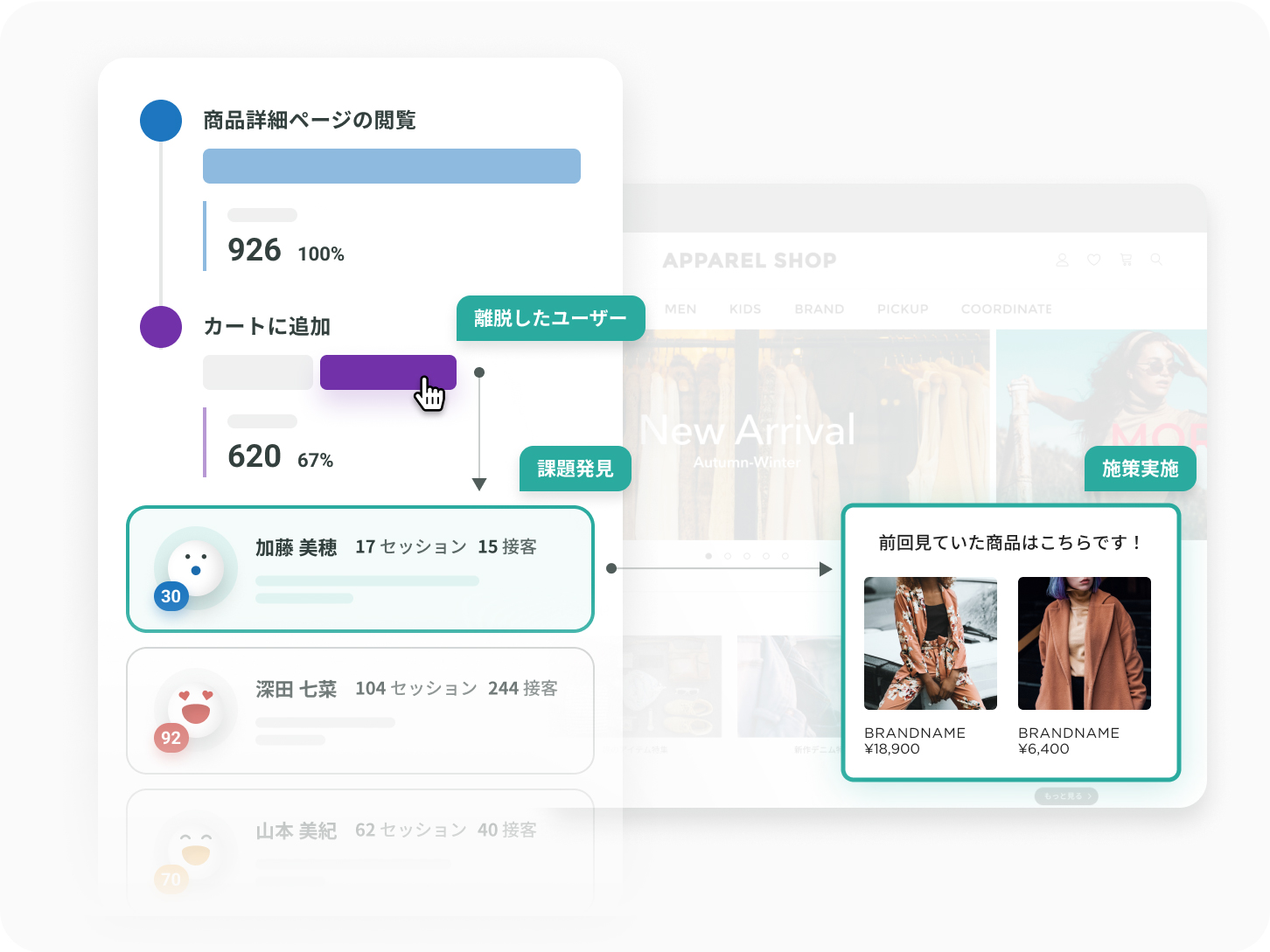 Web 接客の特徴は何と言っても「タグをサイトに入れるだけであらゆるサイト上でのマーケティング施策実施およびそこからマルチチャネルへの情報連携ができる」ことだと思います。以下の画像は KARTE の公式サイトからの引用です。商品ページを閲覧してカートに入れていたが残念ながら離脱してしまったお客さまに対して、次に来訪頂いた際には前回カートに入っていた商品をポップアップでお知らせするという施策を実行しています。Web 接客によって「お客さまを知り・適切なコミュニケーションを取る」ということのイメージが湧いてきましたでしょうか。