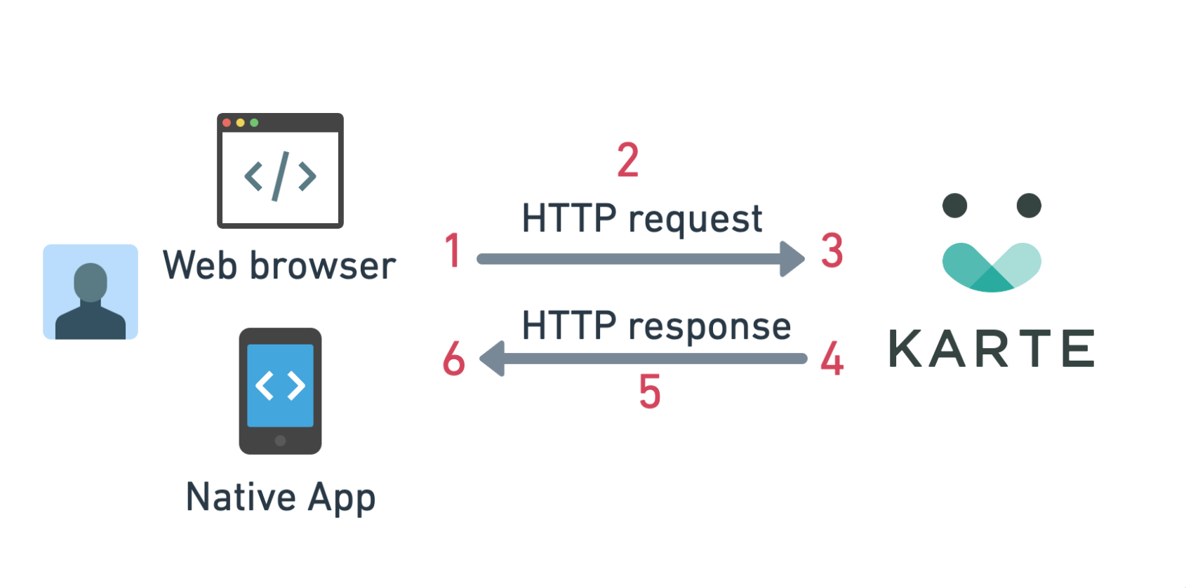 お客さまを知り・適切なコミュニケーションを取る一連の処理の流れは次のようになっています。KARTE 上に蓄積されたカスタマーデータを元にセグメントを解析してお客さまを知り、一人ひとりにあわせた Web 接客を配信します。KARTE タグを導入したサイトから見ると KARTE と通信するだけでブラウザ上で処理が実行されます。サイト側で新たなプログラムを追加・修正する必要がなく KARTE 側で施策の設定・実装をするだけで良いためデジタルマーケティング施策実行の仮説検証サイクルを早めることができます。