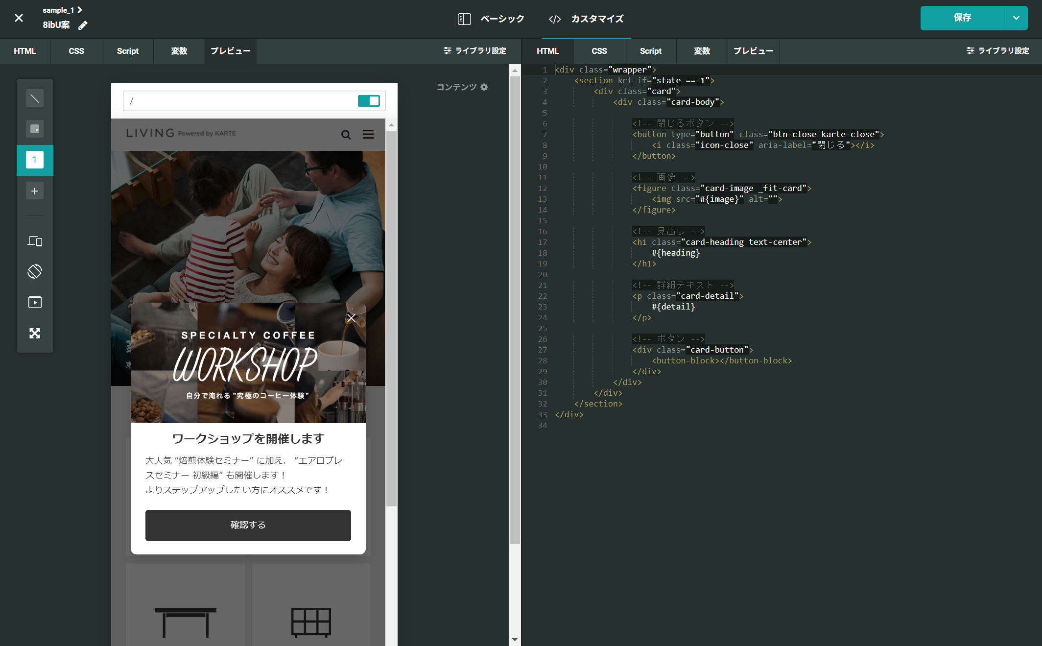 Web 接客は専用の管理画面からブラウザ上で HTML / CSS / JavaScript を開発していくことができます。リアルタイムにプレビューを確認しながらコーディングをしていきます。変更履歴も KARTE 内で管理されています。Web 接客を「停止中」にしておけば、保存してもすぐには公開されません。事前の動作確認をしてから Web 接客を公開できます。