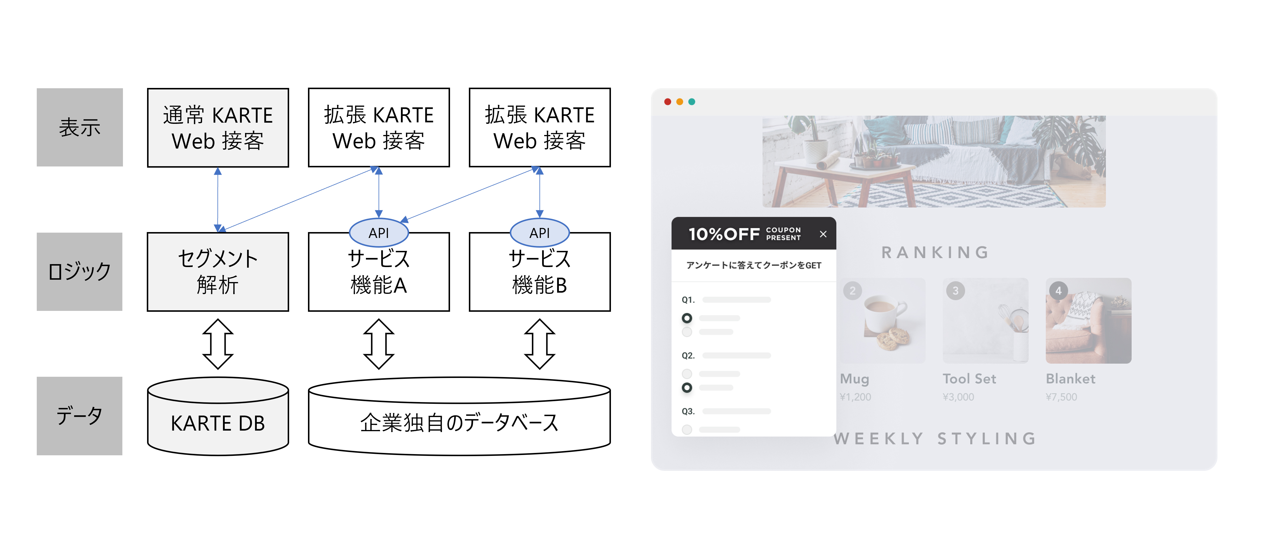 KARTE は前述の通り「商品ページを閲覧してカートに入れていたが残念ながら離脱してしまったお客さまに対して、次に来訪頂いた際には前回カートに入っていた商品をポップアップでお知らせする」というような Web サイト上で完結して収集できるカスタマーデータを元にした Web 接客に強みがあります。
