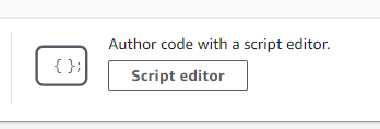 以降は、Script Editorという、手動でコード開発をするベースとなるテンプレートからジョブを作成した状態を想定して進めます。Script Editorは、GlueのAWSコンソールで提供される機能の一つです。Glueジョブをコンソール上で開発するための方法はいくつかありますが、そのうち最もシンプルな、テンプレートコードのみを提供するものが、Script Editorになります。